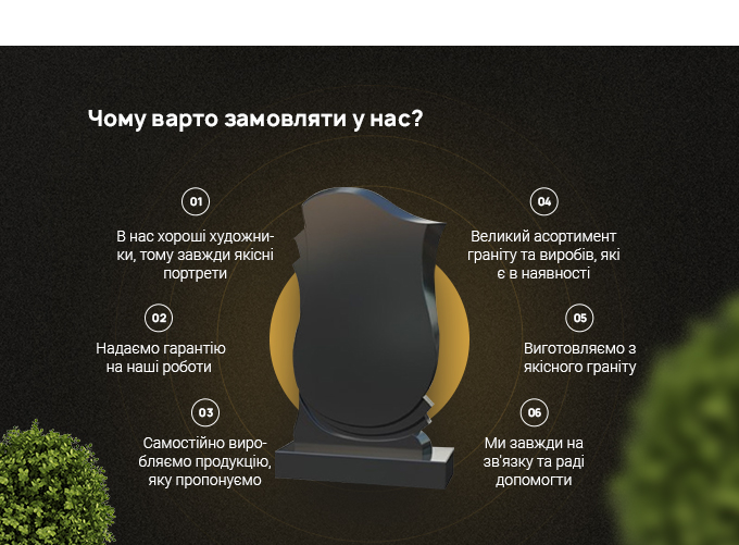 - якісні матеріали: ми гарантуємо, що кожний пам’ятник виготовлено з високоякісного граніту;